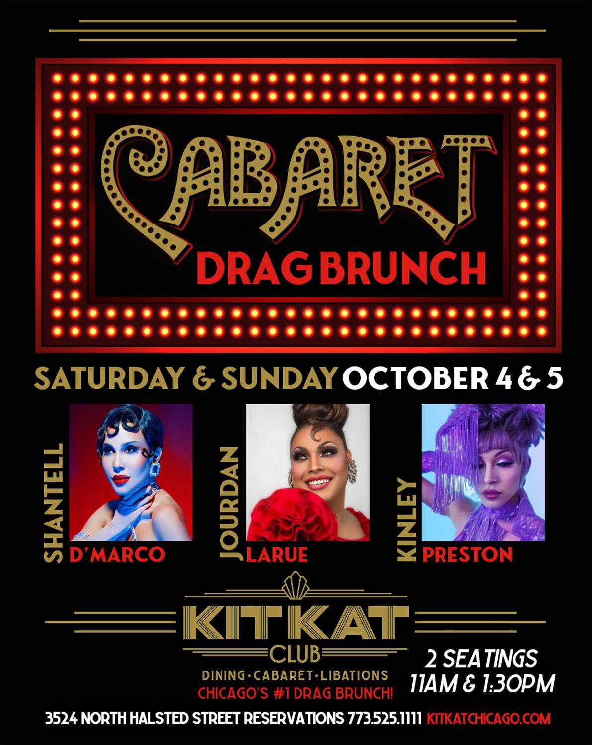 Join us for the Cabaret Drag Brunch at Kit Kat with Shantell D’Marco, Kinley Preston, and Jourdan Larue!