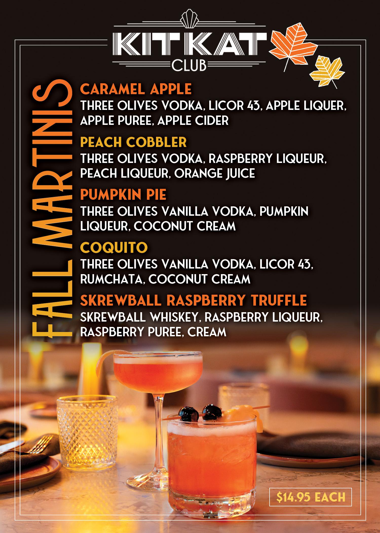 Celebrate the season with Kit Kat Club’s exclusive Fall Specialty Martini Menu — a curated collection of cocktails crafted to capture the warmth, spice, and indulgence of autumn. Designed by our bar team to pair perfectly with crisp nights and cozy evenings, each martini blends elevated ingredients with the signature flair you expect from Kit Kat.