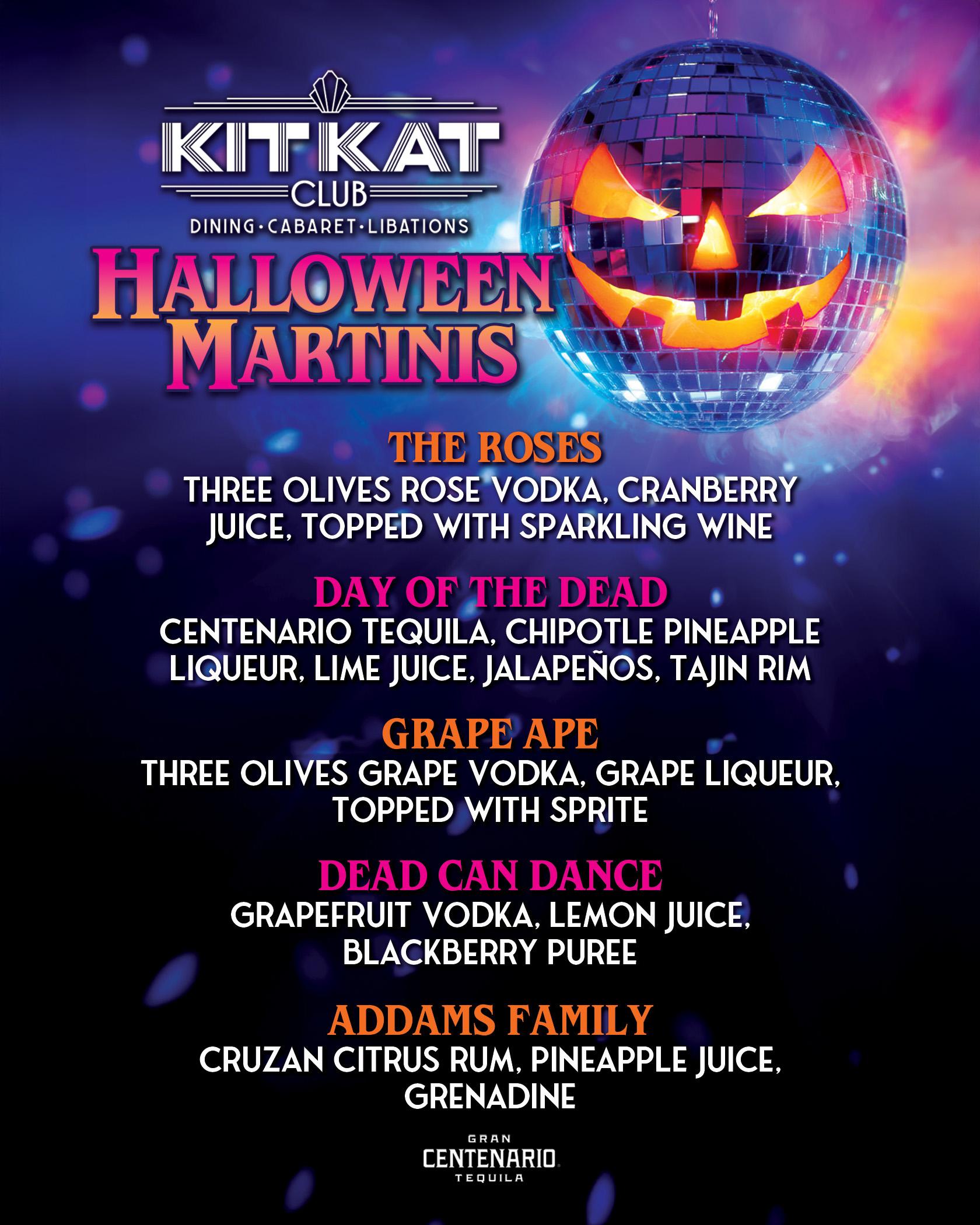 This Halloween season, Kit Kat Club invites you to sip on something spooky! Step into our dazzling cabaret lounge and enjoy a lineup of festive martinis crafted to thrill your taste buds and lift your spirits.
