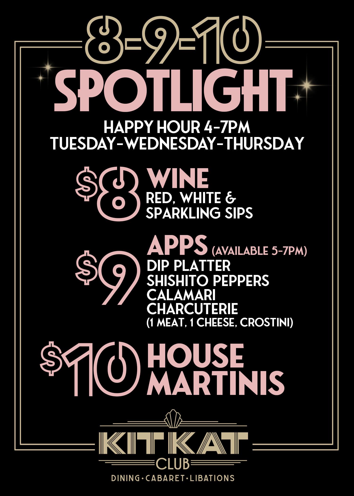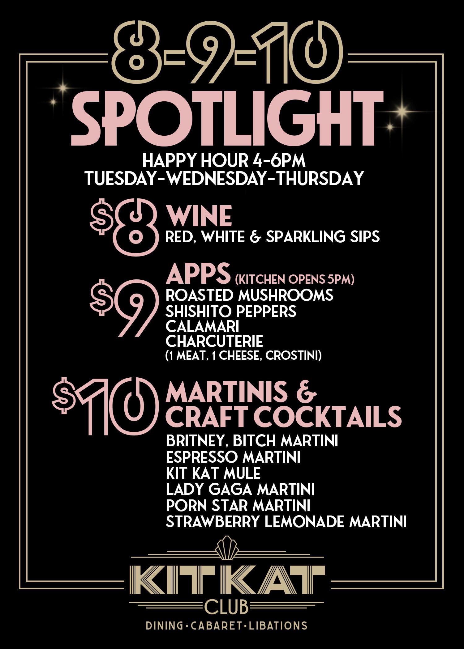 Sip on $8 glasses of wine, savor $9 appetizers, and enjoy $10 martinis and craft cocktails — all served in our glamorous Art Deco-inspired lounge. Whether you’re meeting friends after work, starting your night out in Lakeview, or just looking for a reason to treat yourself, Kit Kat’s Happy Hour is the perfect excuse to indulge.