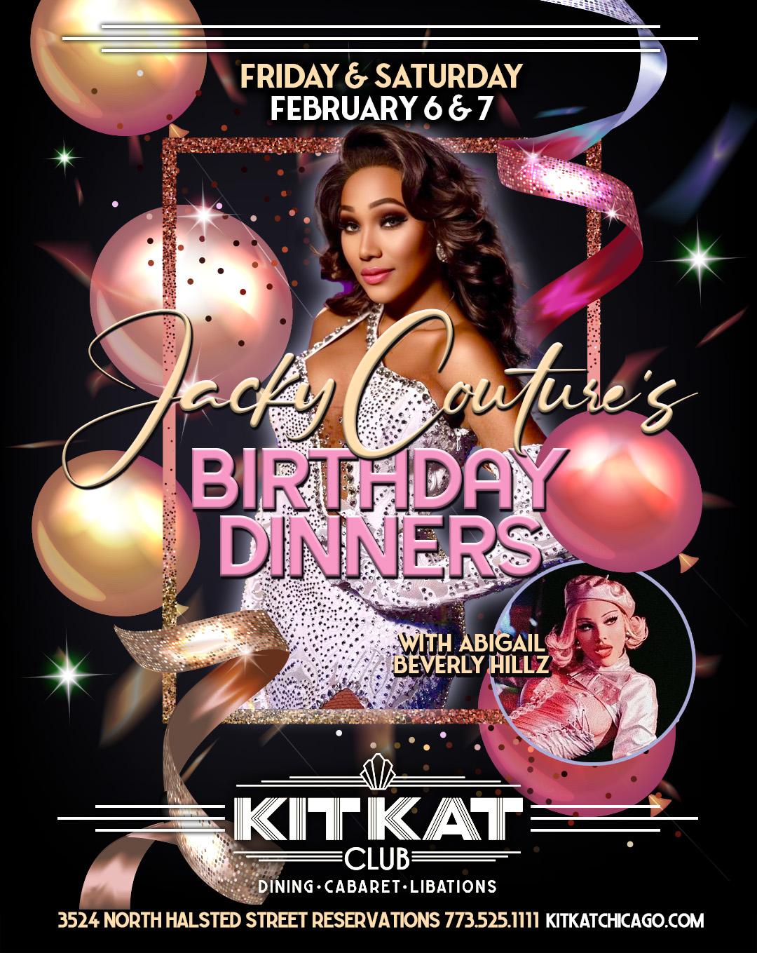Join us for Jackie Couture’s Birthday Drag Dinner! Themed music and costumes with the world famous Kit Kat Divas.