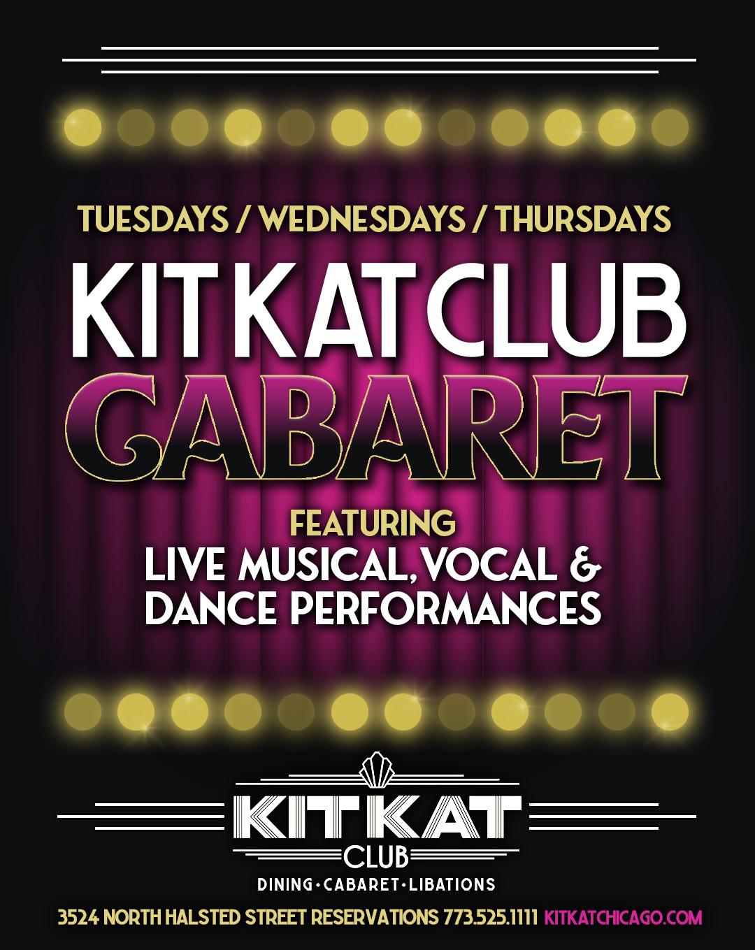 Join us every Tuesday, Wednesday and Thursday for the Kit Kat Club Cabaret! Variety performance all evening.